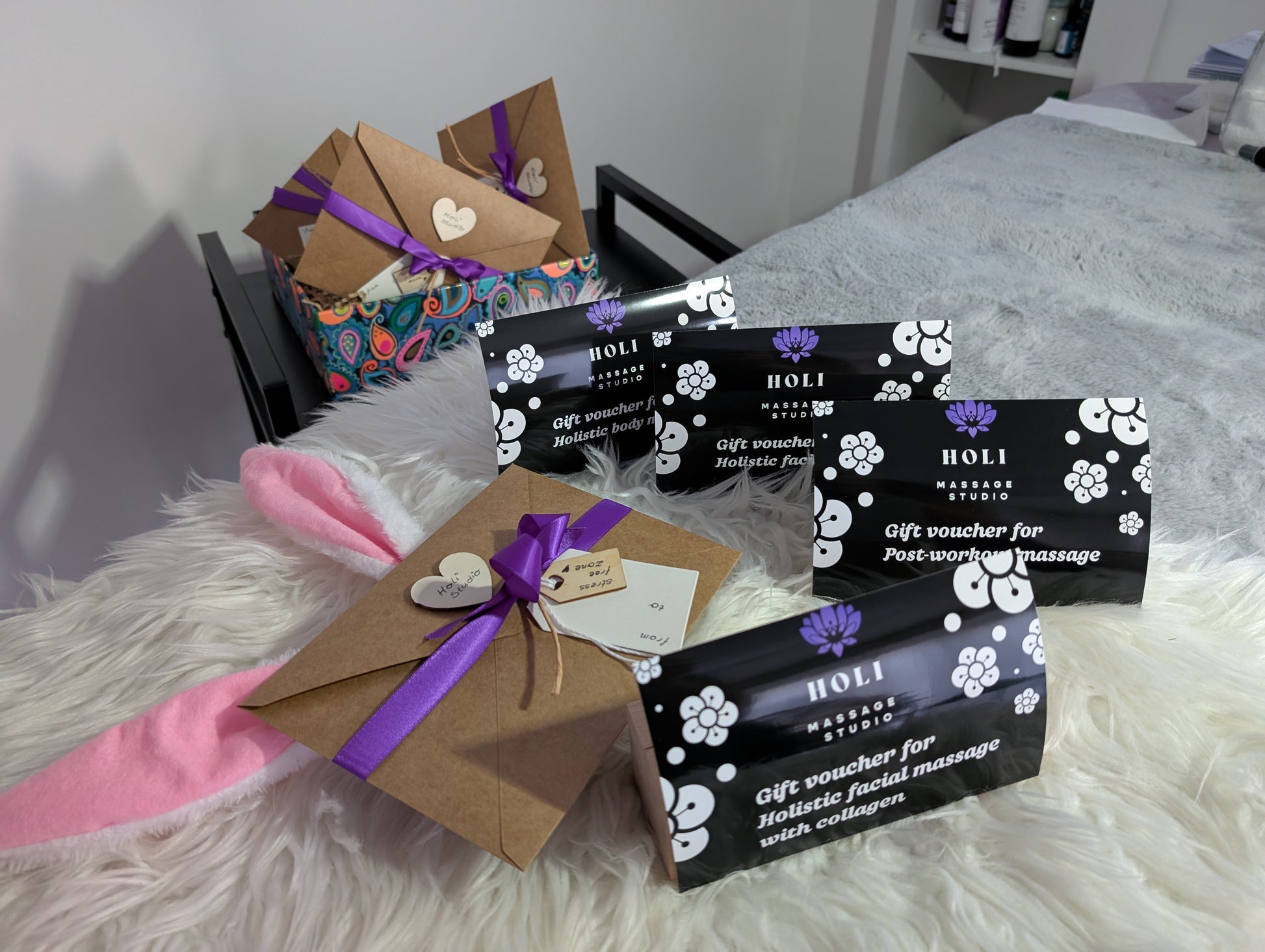 Handmade gift cards for all massages, for any occasion also available in the Holi Studio!